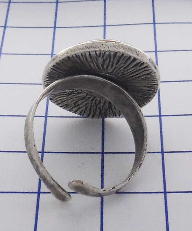 ring zwaar verzilverd, met verstelbare ring die groter of kleiner kan worden gebogen.
